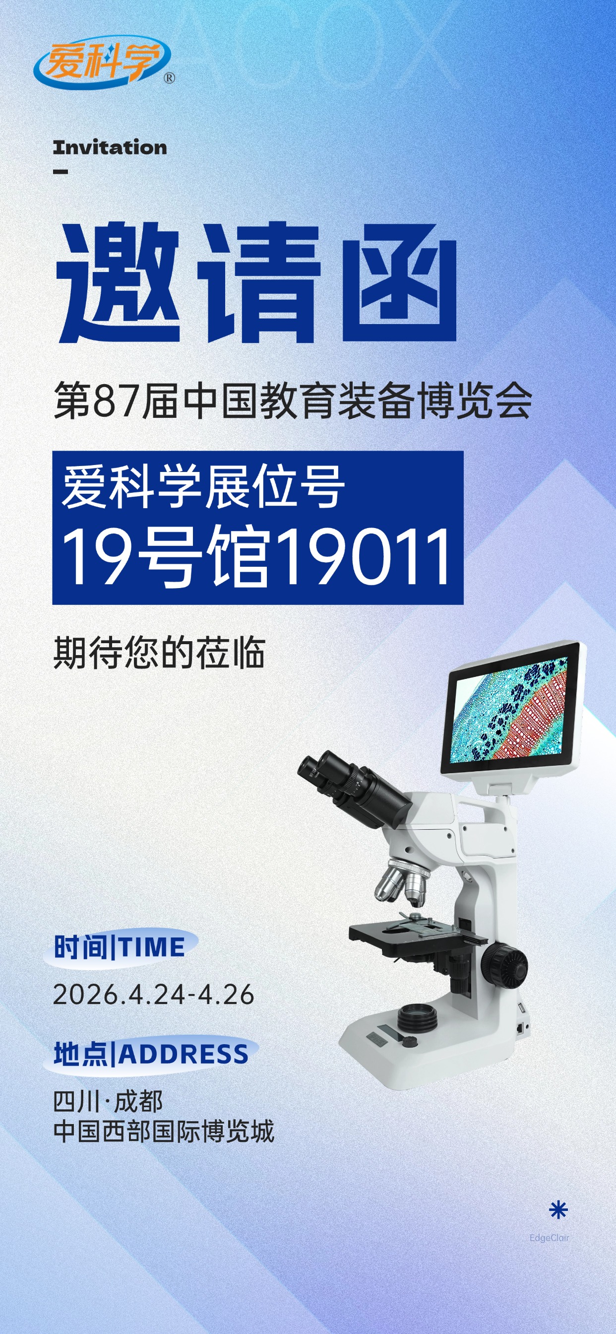 近日,第 87 届中国教育装备展示会于成都盛大启幕。爱科学显微镜携全系教学、科研级光学仪器重磅亮相,凭借优质产品与创新研发实力,收获行业高度关注。
